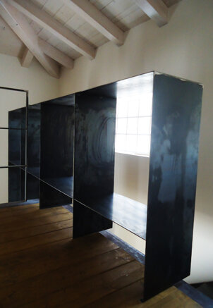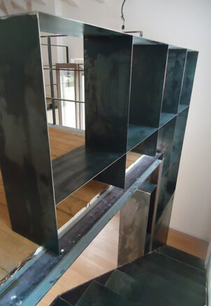 La libreria ha anche la funzione di parapetto ed è realizzata con lamiera nera sp 3 mm, come anche la porta scorrevole al piano terra.